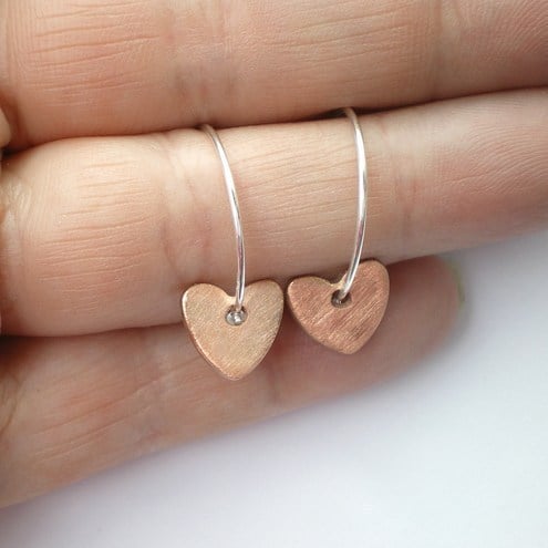 The tiny copper hearts have a brushed finish and measure 0.9cm x 0.9cm. The are hung on sterling silver hoops which measure 1.8cm in diameter and fasten with a simple clasp. Total earring drop is 2.2cm.