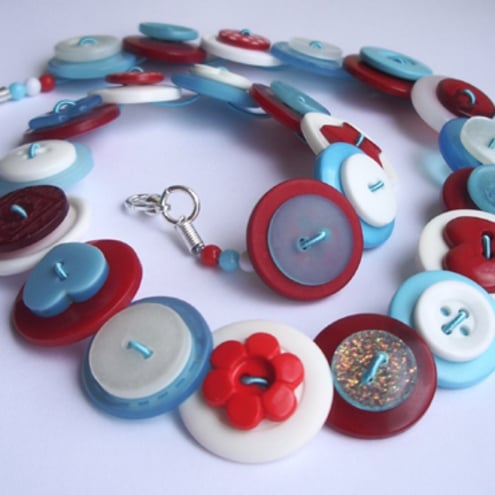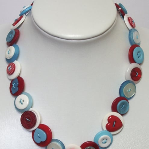 This distinctive button necklace is rich with an assortment of fantastic red, white and aqua buttons. These are threaded onto jewellery wire, which secures at the end with a silver plated lobster clasp fastener.