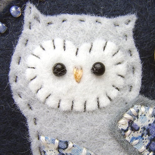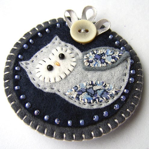 It features a little owl with appliqued wing and belly in pretty Liberty print fabric. It is mounted onto a deep blue circular felt base which is edged with pretty coordinating seed beads. It is further mounted onto a grey felt backing and is finished with a button and ribbon detail. It has a brooch backing for easy attachment.