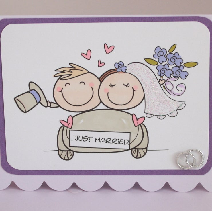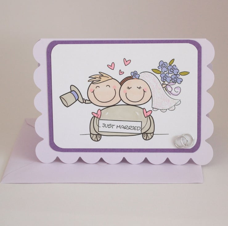 A6 lilac, scalloped wedding card featuring cute bride and groom in car with small wedding rings embellishment. Card is left blank inside for your own message.