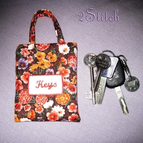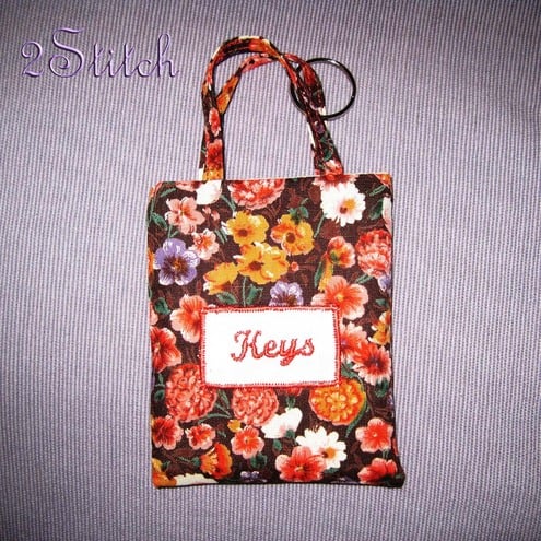 Mini totes are made from patterned cotton fabric and are fully lined with calico. The “Keys” label is machine embroidered onto calico and then attached to front of bag with matching satin stitch. Each one comes with metal key ring attached.