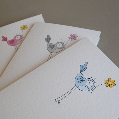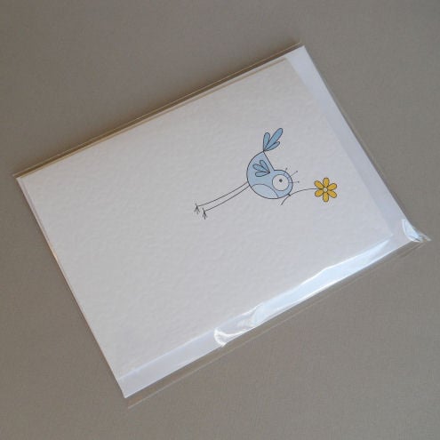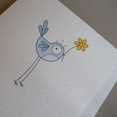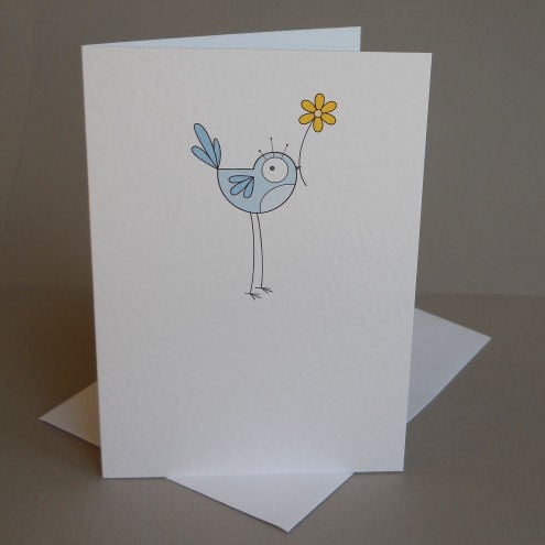 unique and quirky illustrated card featuring a blue bird. he is holding a bright yellow flower, just for you!