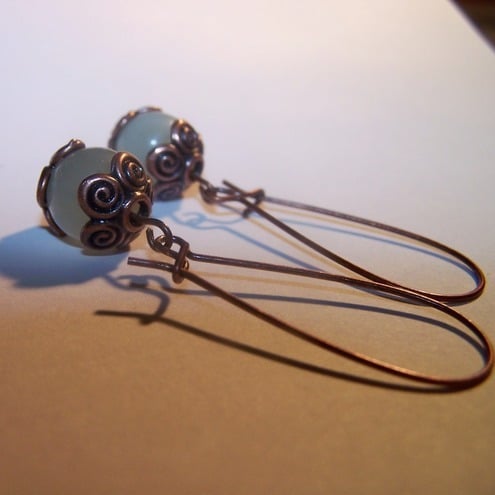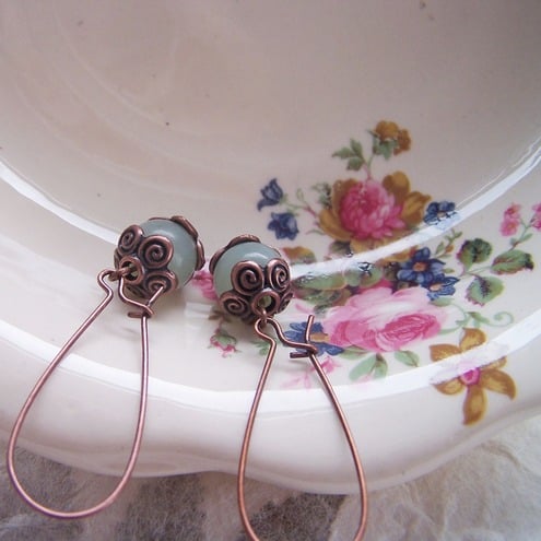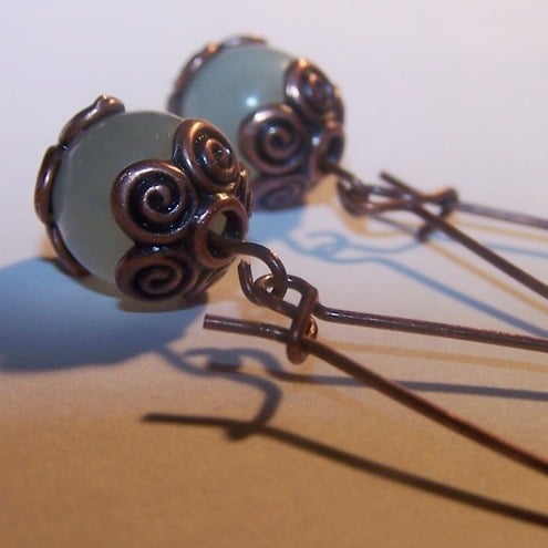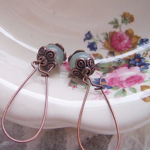 These earrings feature new jade gemstones suspended from long copper earwires to create a simple but very pretty vintage look.
