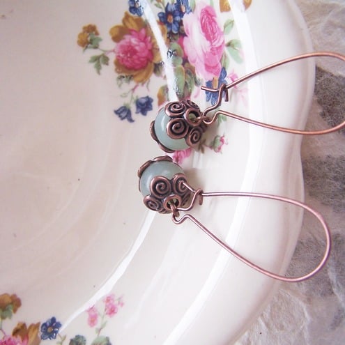 The jade is a beautiful translucent soft greeny colour and the antique copper gives the earrings an old-fashioned look.