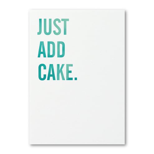 One A6 sized 'Just Add Cake' greetings card, ideal for birthdays and celebrations or just to say hello to all the cake-lovers in your life! Available in four beautiful colours: Blue, Aqua, Orange or Pink. Just let me know your colour choice when you place your order.