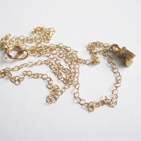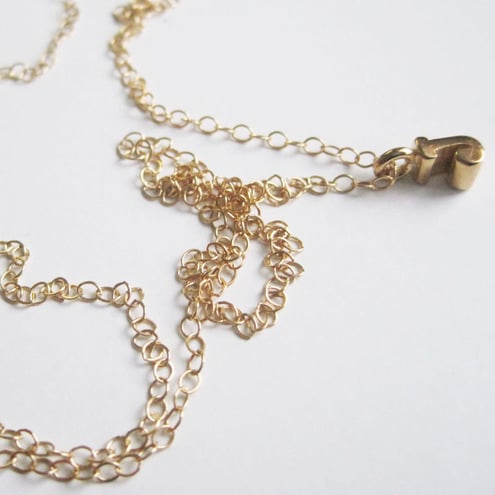 It is hung on a beautiful 14k gold-filled cable chain which measures 16" so that it hangs nicely between your collar bones.