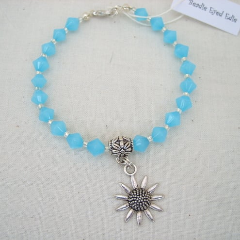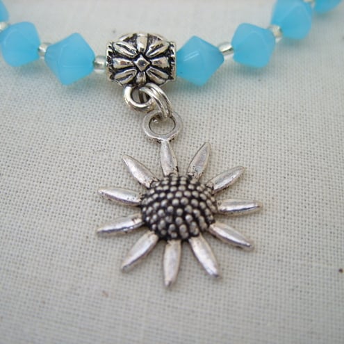 Blue glass bead bracelet with silver daisy charm. Approx. 7 inches (standard)