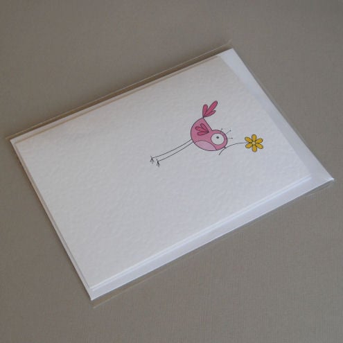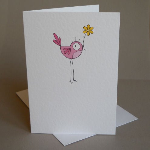 unique and quirky illustrated card featuring a pink bird. she is holding a little pink flower, just for you!