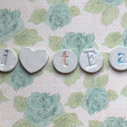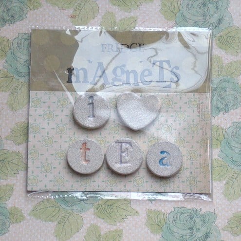 Individually handmade ceramic fridge magnets, reading 'I 'Heart' Tea'. Each letter is stamp with my vintage stamps, and coloured using lovely coloured under glaze, then finished in my trade mark crackle glaze. The magnets come packaged with lovely floral shabby chic style backing and packed neatly in cellophane.
