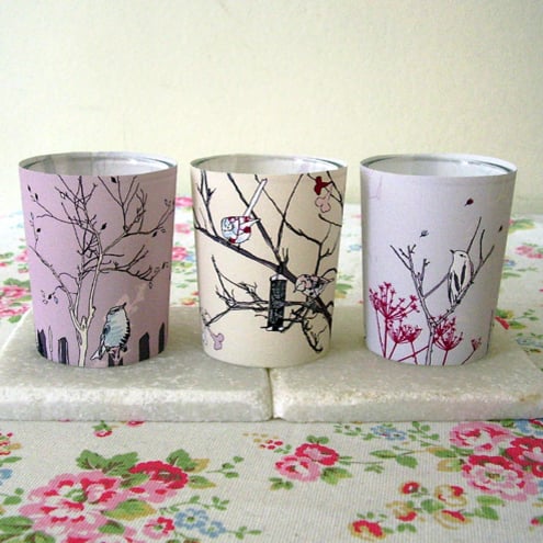 My original littlebirdy designs have been printed onto fire retardant, washable fabric which is then wrapped around a glass tealight holder.