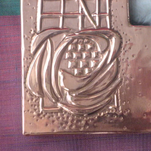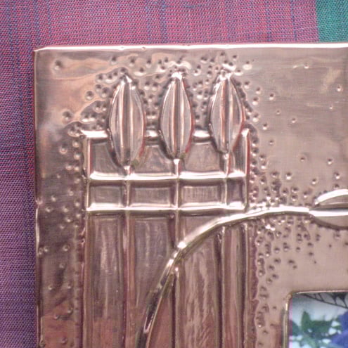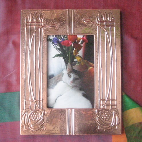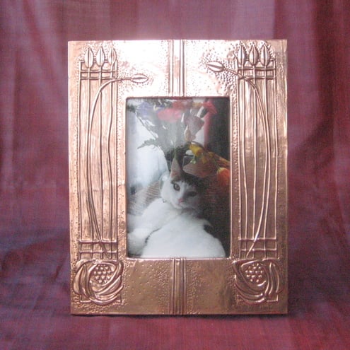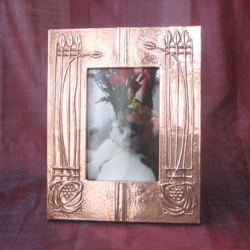 This striking frame has been handmade in copper in the Arts and Crafts tradition. The design comprises elements of the work of Charles Rennie Mackintosh and the copper has been patinated a polished to a rich shine.It measures 195 x245mm overall and takes a photo sized 120 x 150mm.