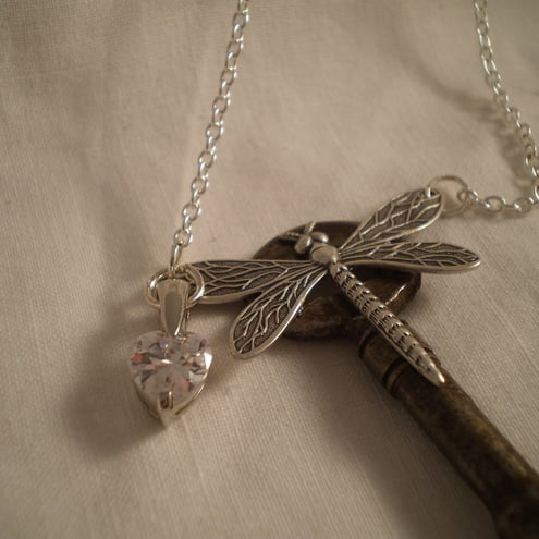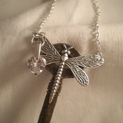 A detailed dragonfly rests on the key and is adorned with a brilliant clear crystal heart.