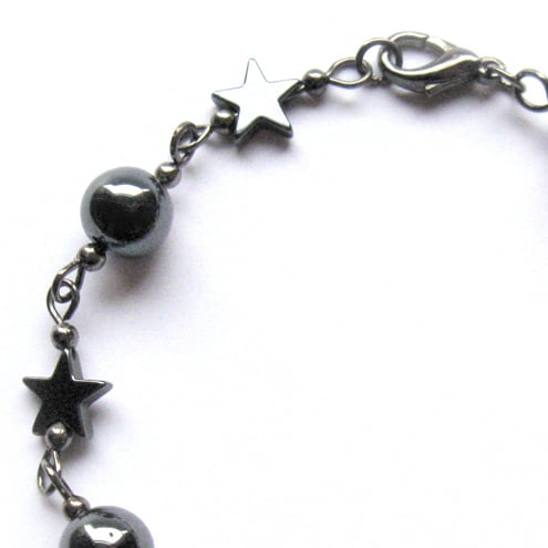 A simple and classic design, I'm really proud of this one! Hematite stars and globes are combined on black-plated, nickel-free links with a secure lobster clasp. Hematite is reputed to have many beneficial qualities, including harmonizing the mind, body and spirit. It also happens to look beautiful! The bracelet measures approx. 7.5 - 8" (19 - 20cm) but can be made smaller or larger on request. I also make Hematite Star earrings and necklaces, these are all for sale in my shop.Your bracelet will be lovingly wrapped and carefully packaged to ensure a safe delivery.