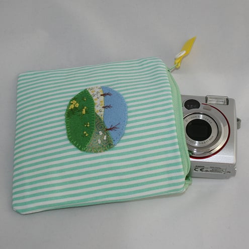 The landscape is appliqueed in cotton fabrics and felt, and then embroidered in embroidery threads. The decorated panel is edged with blanket stitch in green and blue threads. The purse closes with a zip with a ribbon and button tab through the zip pull. The purse is made from a green and white striped canvas fabric. It is lined with a pale yellow, soft flanalette fabric. The purse is reinforced with heavy weight interfacing.