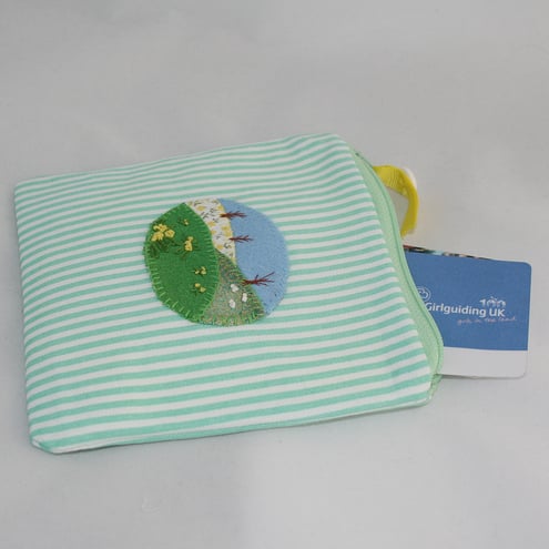An embroidered panel, featuring an appiqueed spring scene with primroses and distant sheep, decorates the front of this zipped purse.