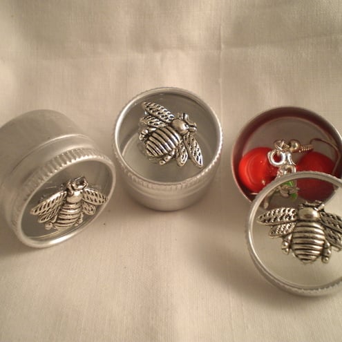 The tins are metal with a clear glass top, which I have embellished with a antiqued silver bee charm. They will hold a chain or small pendant, a ring or pair of stud or small earrings.
