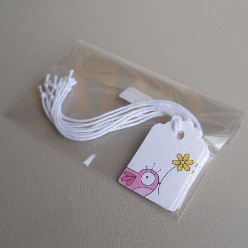 each tag is 4.5cm x 3cm, and comes ready to hang with white thread (approx. 12cm long). packaged in a clear polythene bag.