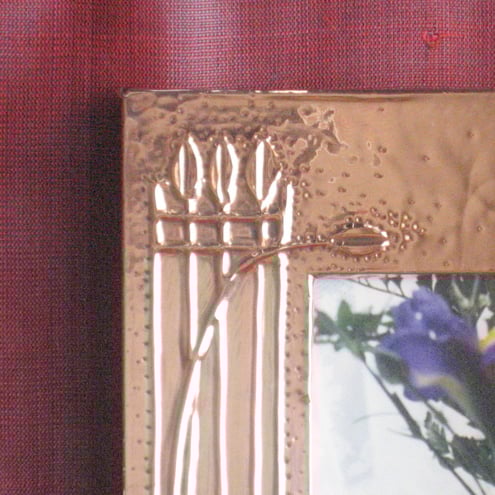 This frame has been hand-made in copper in the Arts and Crafts tradition. The design comprises elements of the work of Charles Rennie Mackintosh and the copper has been patinated and polished to a rich finish.