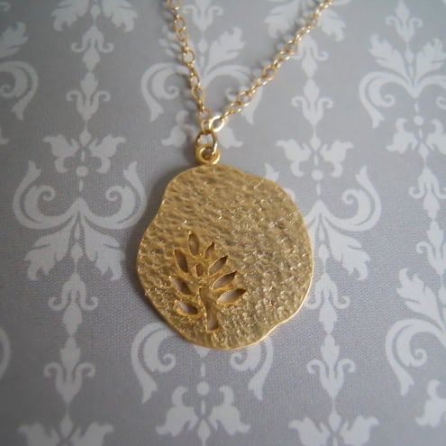 This is a lovely gold plated pendant with a hollow cut out tree/leaf within. It hangs on a chain that measures just under 28 inches. You could have it on a shorter chain if you prefer.
