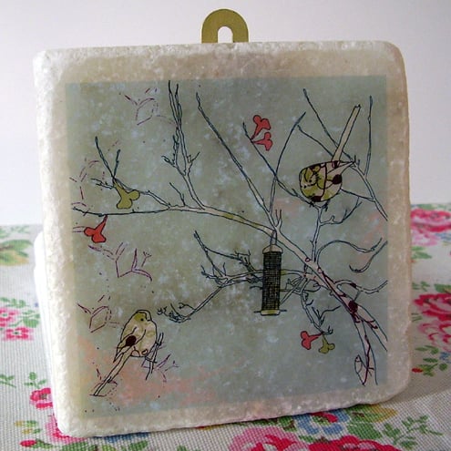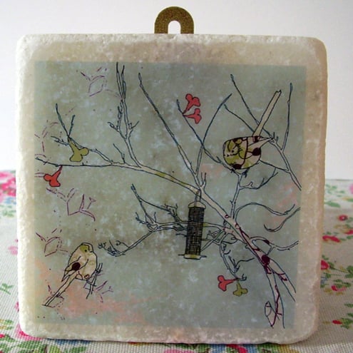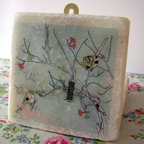white marble tile featuring an original 'littlebirdy' design to hang on your wall!