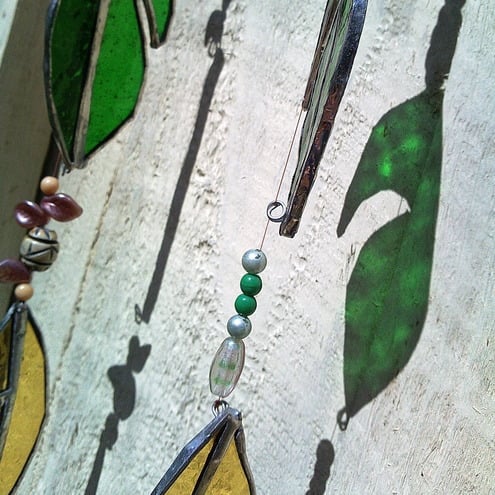 They are made using the copper foil technique of glass making and are strung with wire and beads, each leaf is different and each string unique due to the properties of the glass and the beads. Hung with driftwood and my brand ribbon.