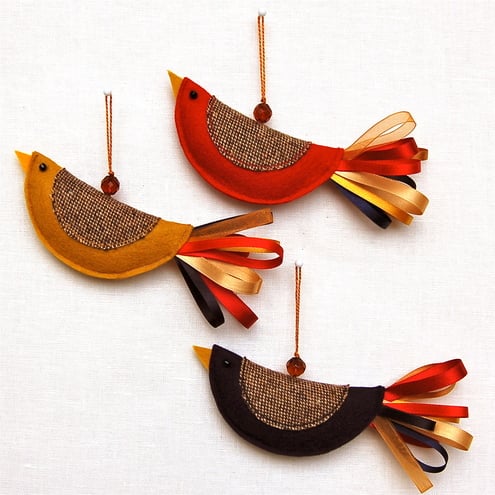 Three bird decorations in navy, red and gold made from wool felt and tweed, with mixed ribbon tails and glass bead eyes. Hanging threads also with glass beads.