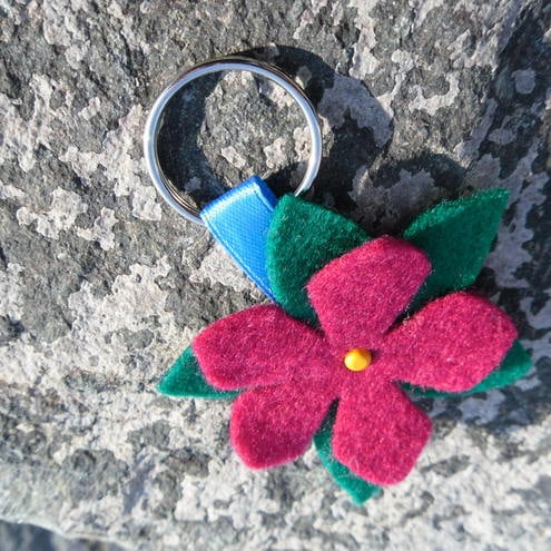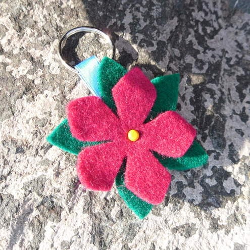 Flower cut out of pink felt with a tiny brad in the centre with breen leaves at the back.