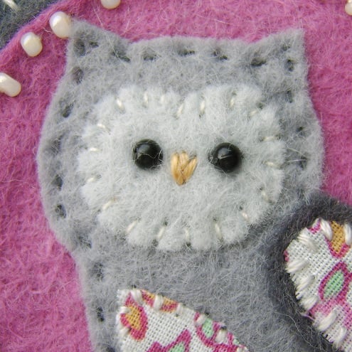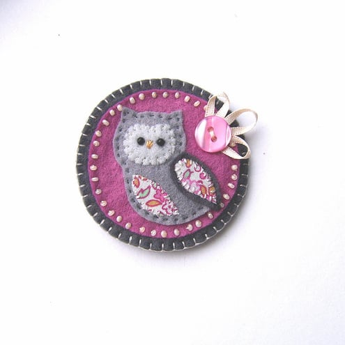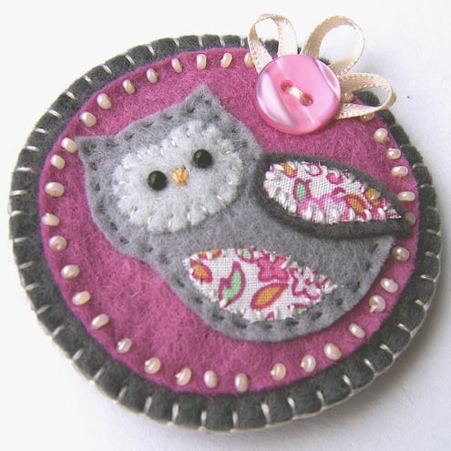 It features a little owl with appliqued wing and belly in pretty cotton print fabric. It is mounted onto a pink circular felt base which is edged with pretty cream seed beads. It is further mounted onto a grey felt backing and is finished with a button and ribbon detail. It has a brooch backing for easy attachment.