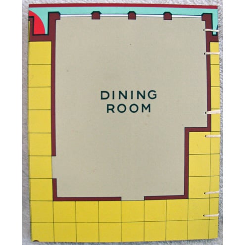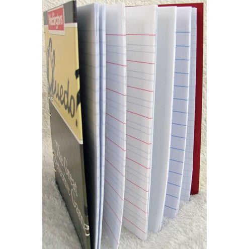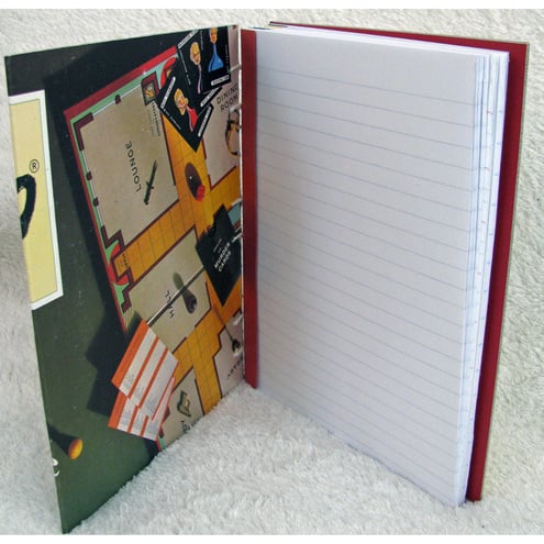 This notebook has been lovingly re-crafted from a Cluedo board game box cover and a section of the board itself. Measuring a handy 6 ¼” (16cm) wide by 8” (20cm) tall, the front cover is made from the game box and back cover is made from a section of the game board.