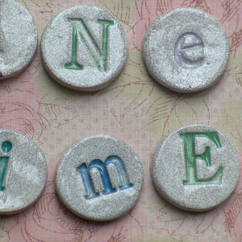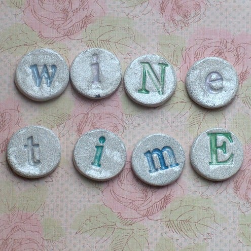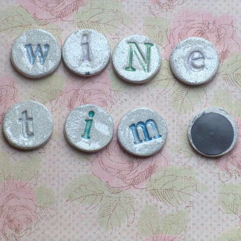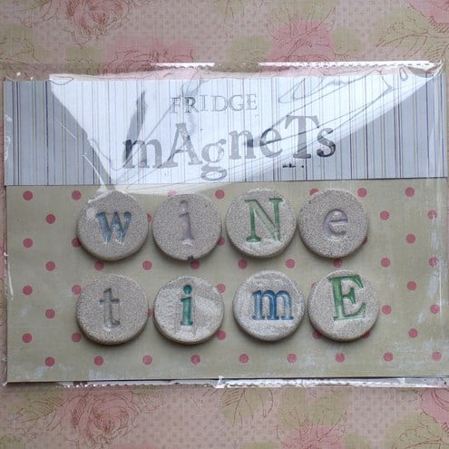 Individually handmade ceramic fridge magnets, reading " WIne Time". Each letter is stamp with my vintage stamps, and coloured using lovely coloured under glaze, then finished in my trade mark crackle glaze. The magnets come packaged with lovely vintage style paper backing and protected in a cellophane packet.