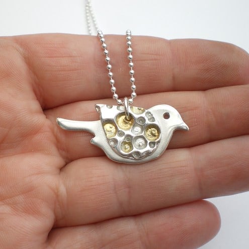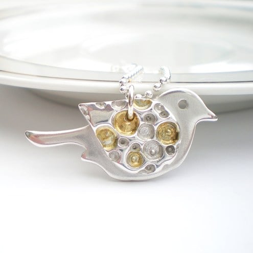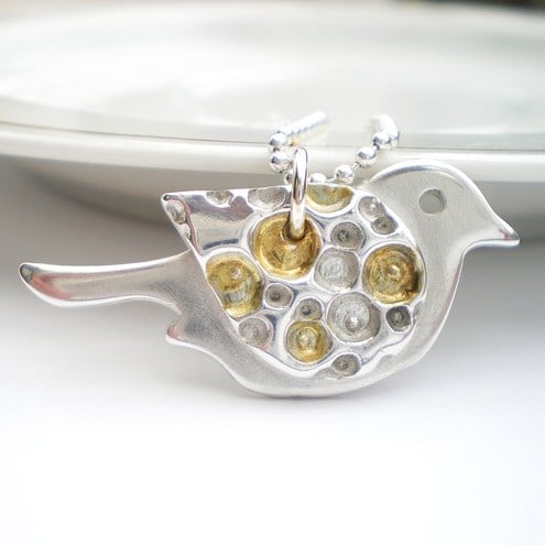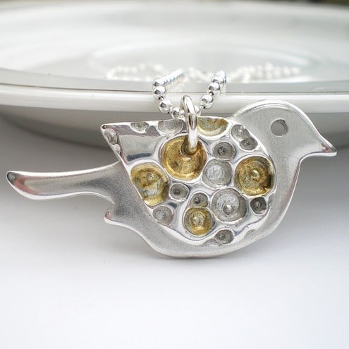 Bigger than my other tiny birds, he measures 3.5cm (1 1/2 inches) from beak to tail and 2cm across his tummy. His wing has a deep set coral texture which has 24K gold fused to parts of the texture and then the remaining silver surface has been polished to a soft shine. The texture really stands out beautifully!