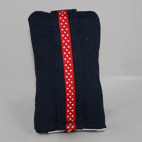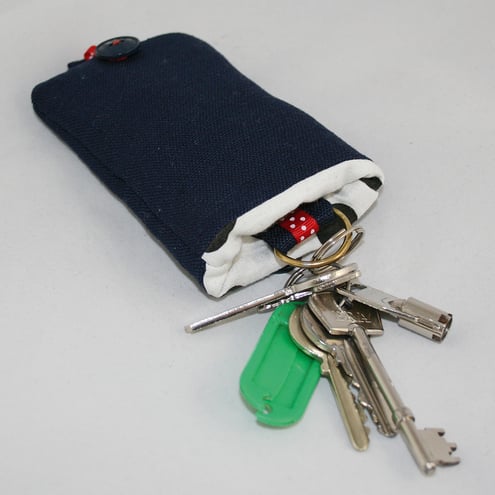 A linen-type, royal blue fabric has been chosen for the body of this case. A fanciful flower, in shades of red and orange, has been hand-embroidered onto the front of the case. Attach your keys to the split ring suspended from the integral key fob. The fob is drawn up through the case and fastens with a red ribbon loop over a button on the front of the case. When the fob is drawn down through the case, to access your keys, the ribbon loop is transferred to a second button near the top of the case (this prevents the fob pulling all the way through the case - although it is easily re-threaded if this occurs!) The fob is decorated with a red ribbon with white spots. The blue buttons are stitched in place with red thread to maintain the colour theme. The case is lined with a black spots on white fabric.