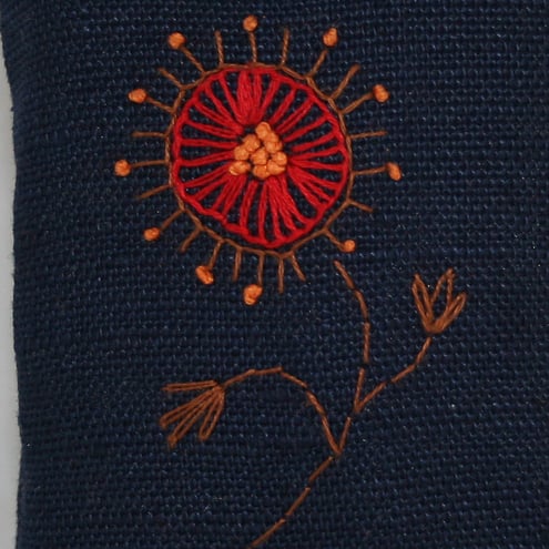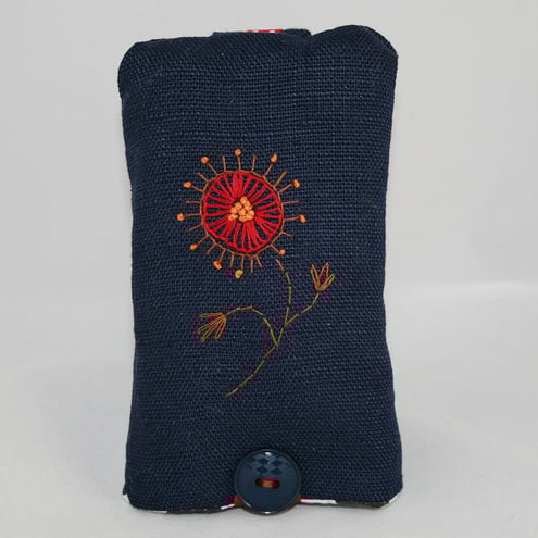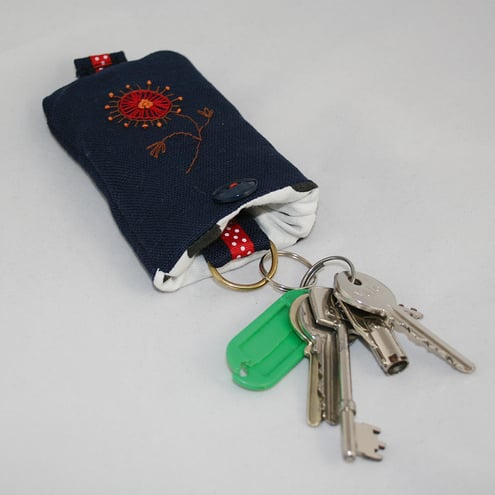Hand embroidery in striking shades of orange and red, against a royal blue background, decorates this pretty and practical sliding key case (with integral fob) - padded to protect other items from your keys!