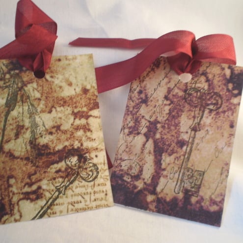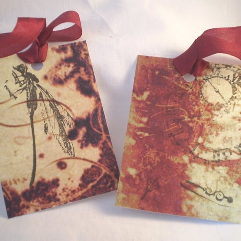 These Steampunk style gift tags have wonderful distressed images for the background.... hand stamped with vintage keys, dragonfly and a butterfly. A matching tonal ribbon makes them prefect for that unusual finishing touch to any gift..... also very appropriate for any man you have to buy for.