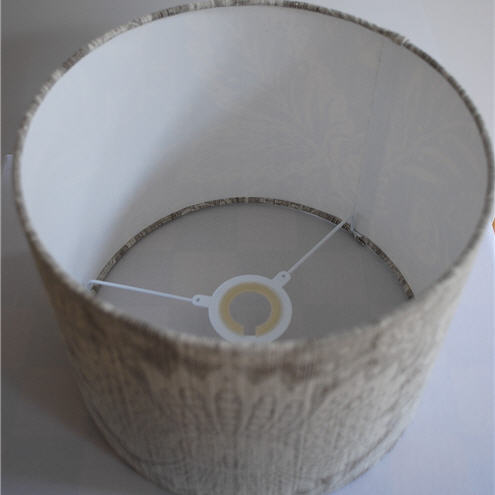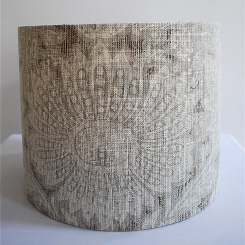This is a hand rolled Drum shade designed for use with either a lamp or ceiling fitting. The beautiful Paysanne printed fabric in subtle shades of Stone is one of the many wonderful fabrics produced in the UK by Stroud based designers, Lewis & Wood.