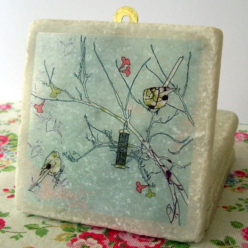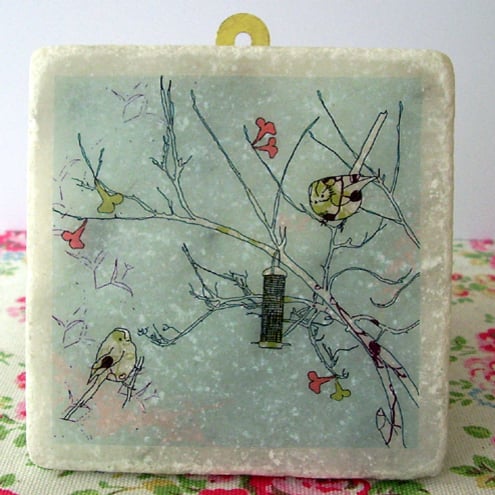 white marble tile featuring an original 'littlebirdy' design to hang on your wall!