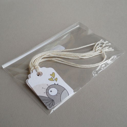 each tag is 4.5cm x 3cm, and comes ready to hang with an ivory coloured thread (approx. 10cm long). packaged in a clear polythene bag.