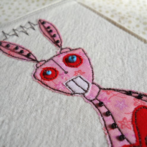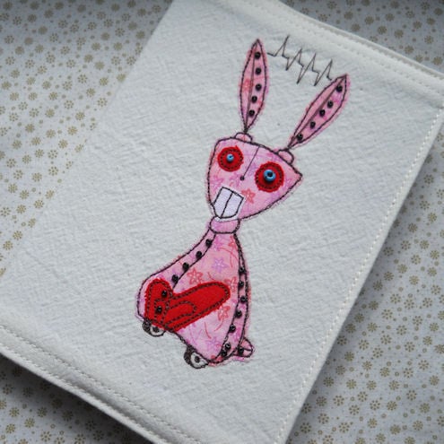 the rabbit is in a pale pink cotton fabric, which is appliqued onto pre-washed calico, before being "drawn" on with free machine embroidery, and features tiny beads for eyes and rivets.
