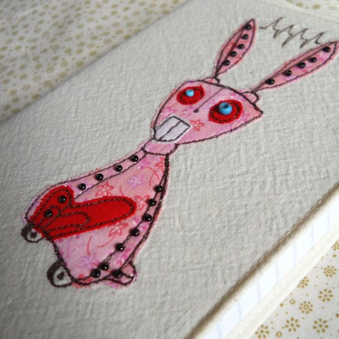 this fabric notebook cover features an embroidered rabbit on the front cover. perfect for fans of zombies, robots and rabbits!