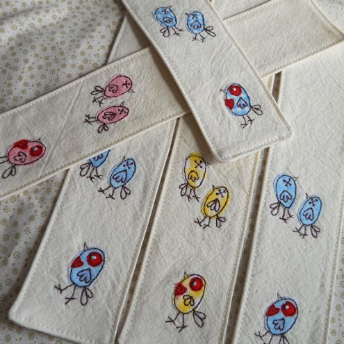 the chicks are in cotton fabrics which are appliqued onto calico, before being "drawn" on with free machine embroidery. they’re available in a variety of colours – please let me know which you’d like when ordering: 1x blue still available