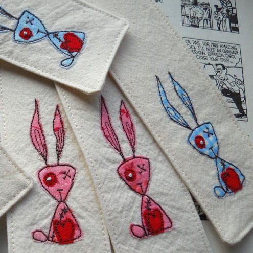 the rabbits are in cotton fabrics which are appliqued onto calico, before being "drawn" on with free machine embroidery. they’re available in a variety of colours – please let me know which you’d like when ordering: 1x blue print still available