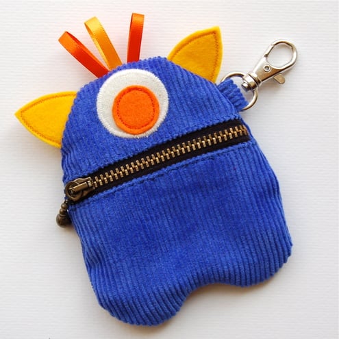 Small blue monster purse in cotton corduroy fabric with wool felt eyes and ears, lined in bright striped cotton.