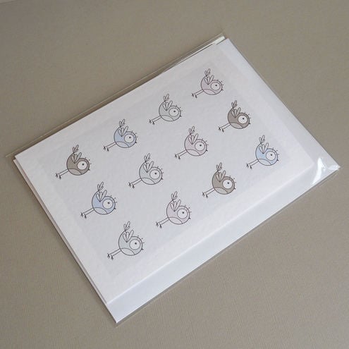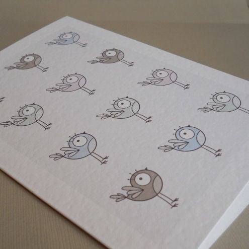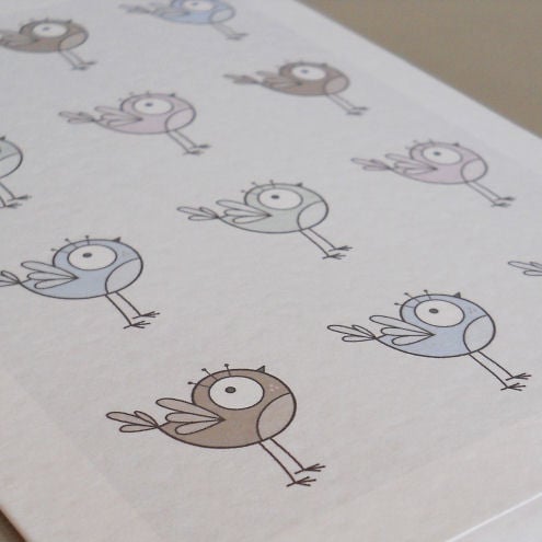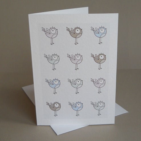 cute and quirky card featuring 12 mini birds, each coloured pale pink, pale brown, pale blue, and pale green, all on a very pale blue background.