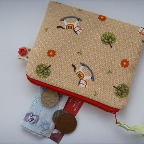 Cute little rocking horses credit card / coin purse with contrasting ribbon, zip, beige lining and button tag