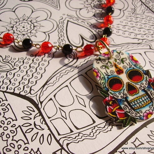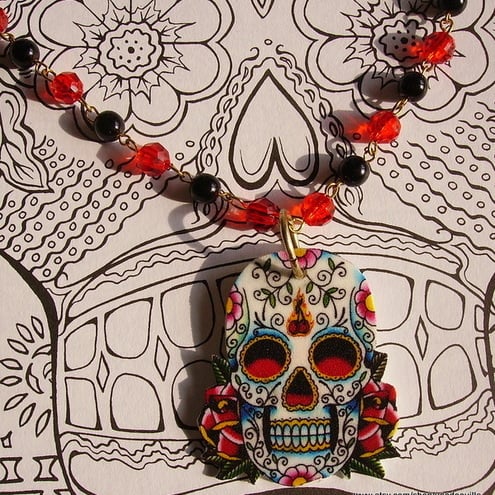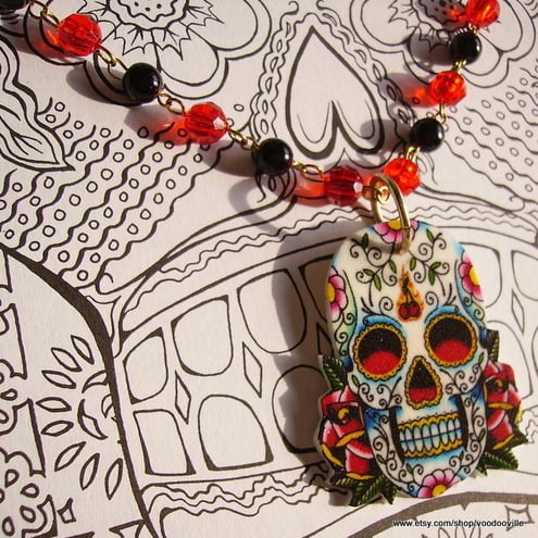 Shrink plastic Mexican day of the dead sugar skull pendant embellished with red and black beads assembled in a rosary style. The chain is approx 18 inches long. The skull measures approx 2 inches high.