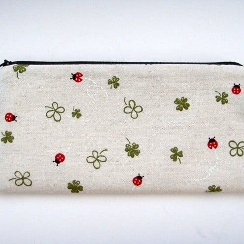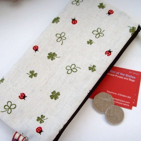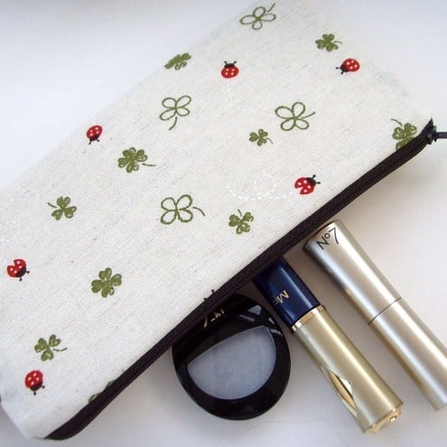 Cute little make up bag/ pencil case with brown zipper and contrasting ribbon and lining
