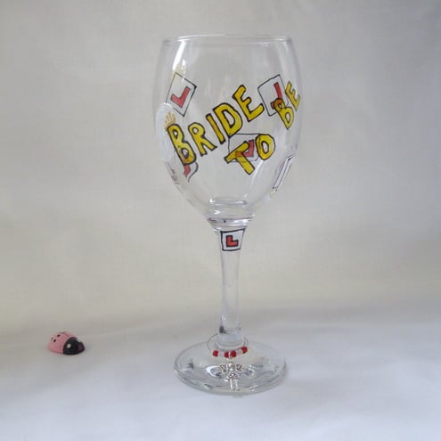 A fabulous ‘Hen Night’ gift for the Bride to be. This glass can be personalised or customised in any way, maybe the Bridesmaids or Chief Bridesmaid to be will want to join in the fun!!. I can also add names. Dates etc.
