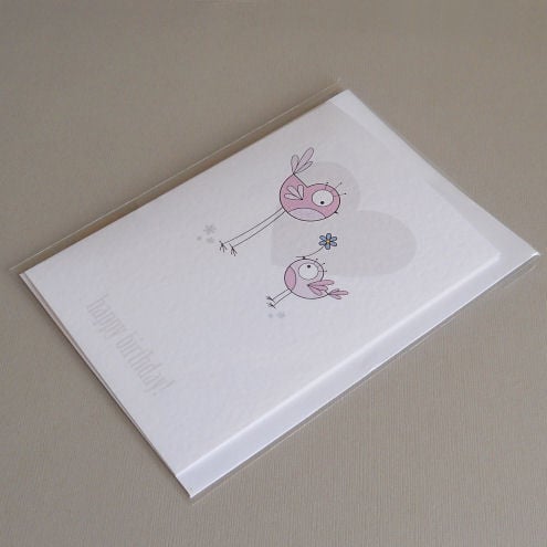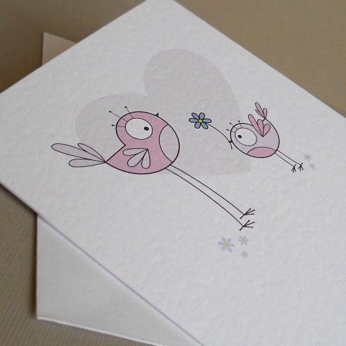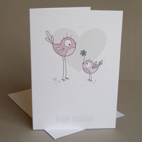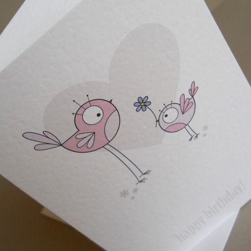 unique and quirky illustrated card featuring 2 birds in shades of dusky pink. the little bird is giving the bigger bird a blue flower - must be its birthday!