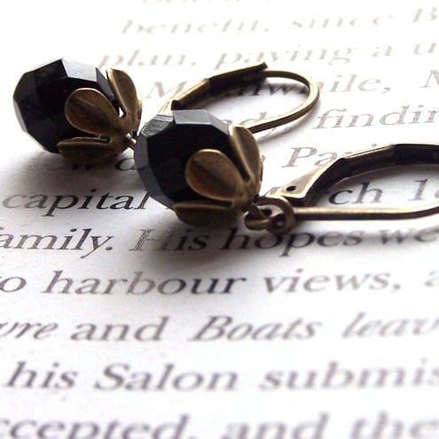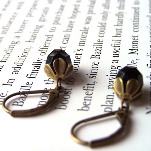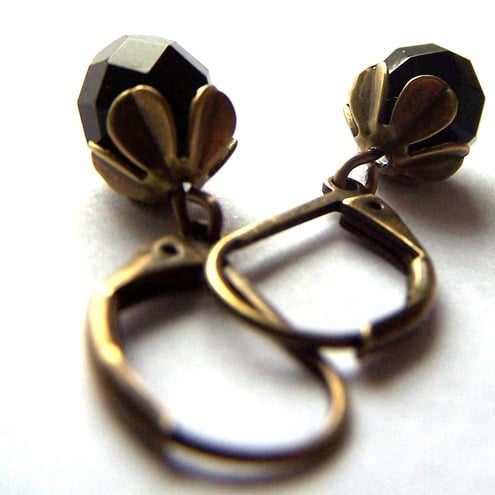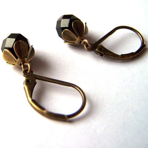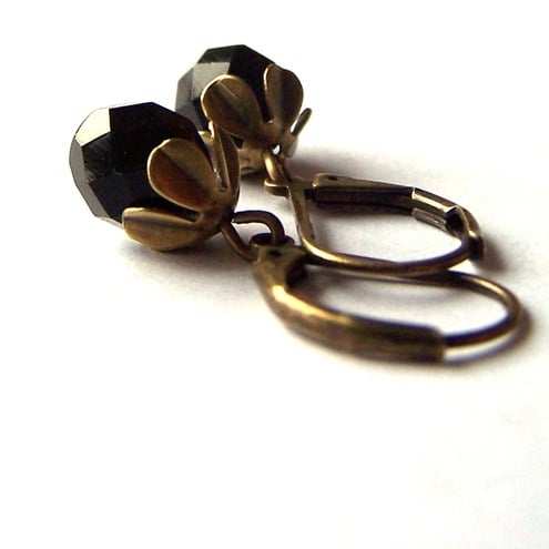 The faceted black glass beads are very simple but elegant, complemented by the brass flower beadcaps.