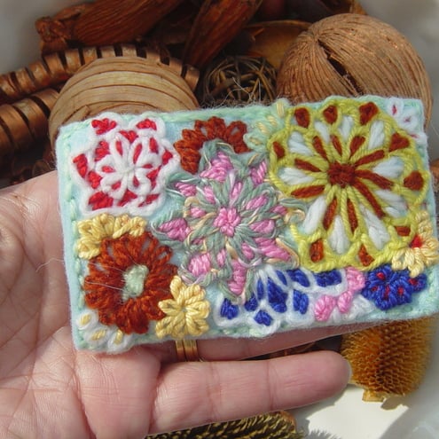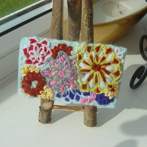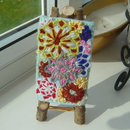 Abstract Floral is an embroidered Yarn and felt slightly over large ACEO, featuring embroidery on a double layer of pale blue felt, which is then yarn edge sewn, to ensure minimal cotton and yarn workings can be seen from behind.